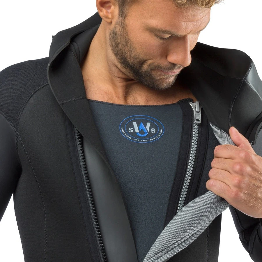 La combinaison se caractérise par le système WATER STOP SYSTEM, dans lequel une brassière interne particulière en matière ULTRASTRETCH crée une double barrière contre les infiltrations d’eau ainsi qu’une meilleure isolation thermique.