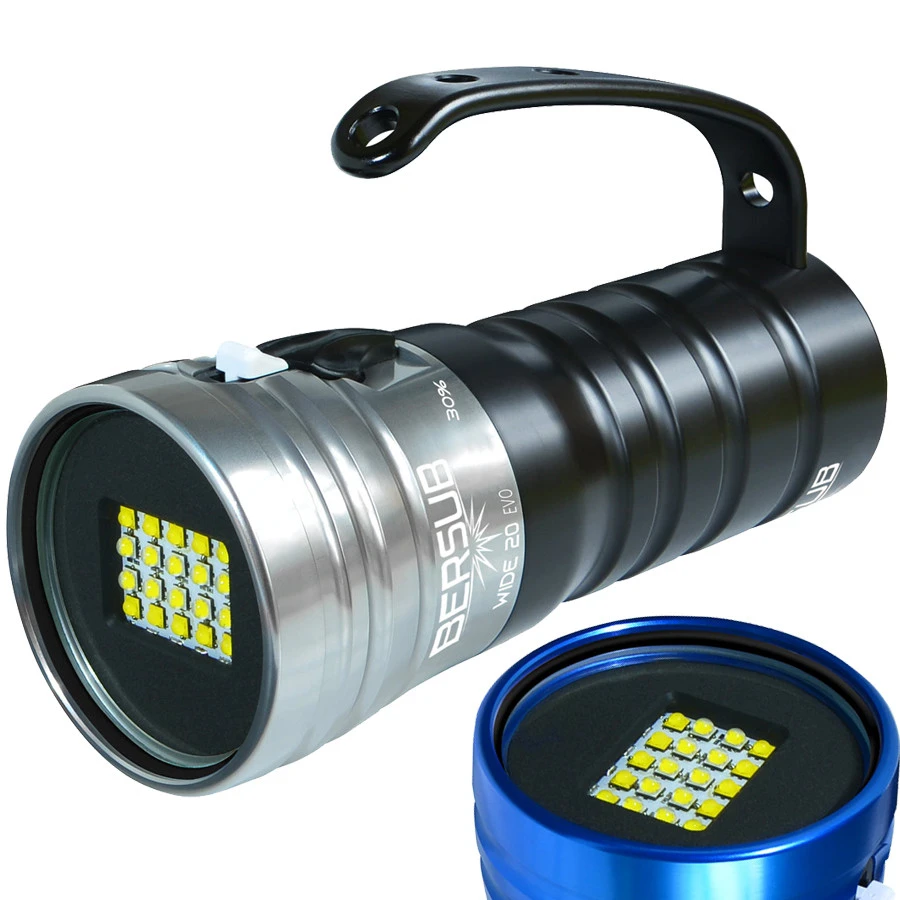 Phare de plongée Bersub Wide 20 EVO, une valeur sûre pour professionnels ou amateurs de la photo sous-marine. Puissant, avec un faisceau large de 130° parfaitement homogène et une température de couleur de 5700K Blanc pure.